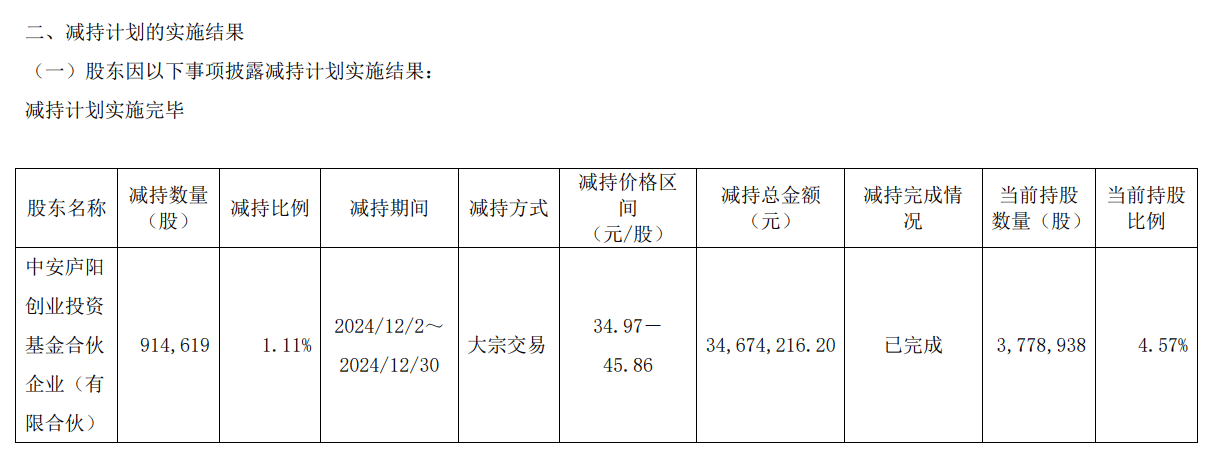减持前,恒烁半导体(合肥)股份无限公司(恒烁股份)股东合肥中安庐阳创业投资基金合股企业(无限合股)(简称:中安庐阳)持有公司股份4,693,557股,占总股本的5。68%。中安庐阳通过大买卖体例累计减持公司股份914,619股,占总股本的1。11%,本次减持打算曾经实施完毕。